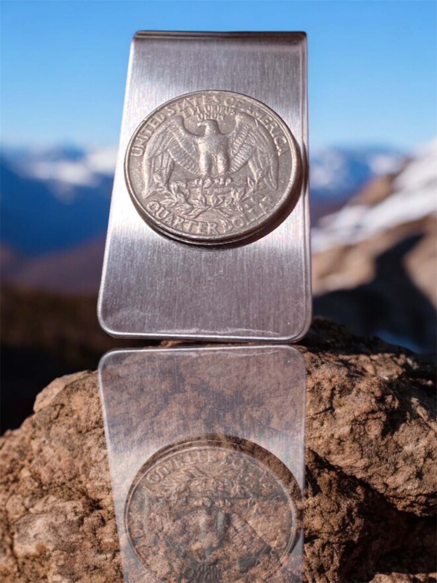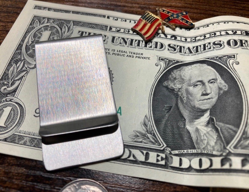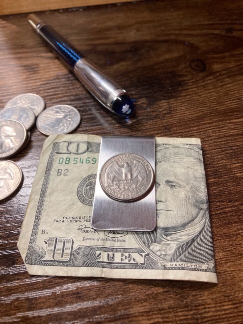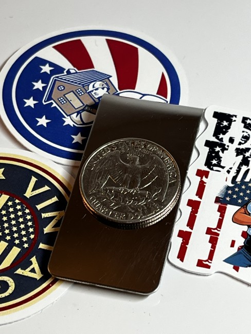 Pince à billets neuve surmontée d'une pièce dollar USA