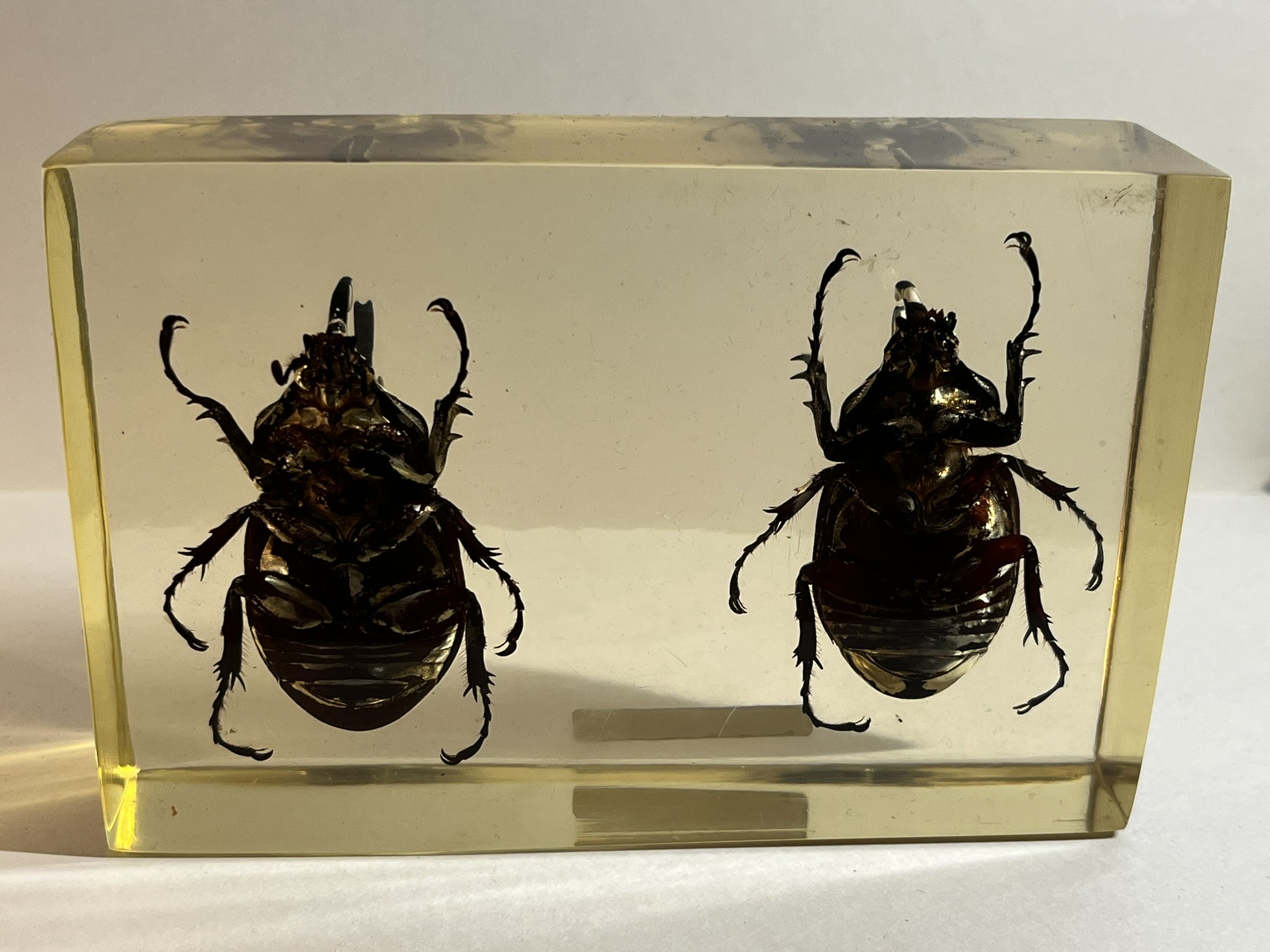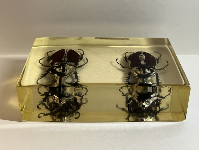 très jolie inclusion vintage de 2 scarabées rhinocéros, Aegosoma Centaurius