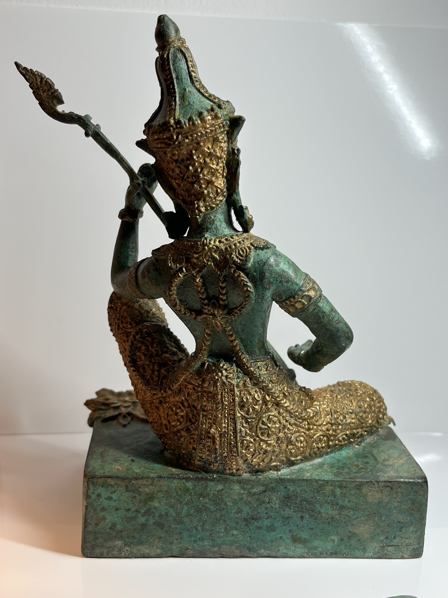 Ce bronze a une patine vert foncé, le costume de cérémonie et les bijoux sont ornés de feuilles dorées.
