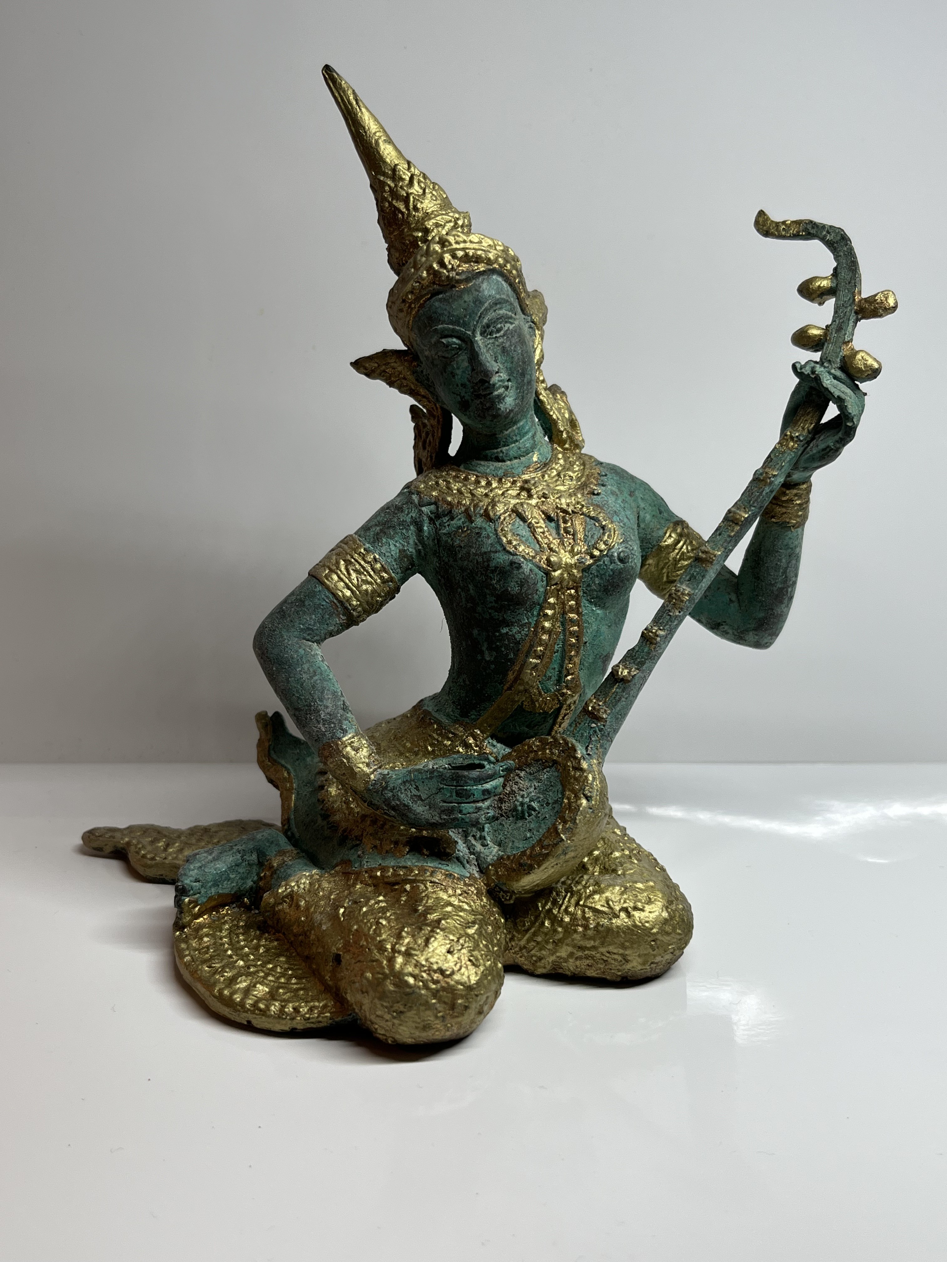Superbe Statue vintage en bronze d'une nymphe musicienne jouant d'un instrument traditionnel asiatique