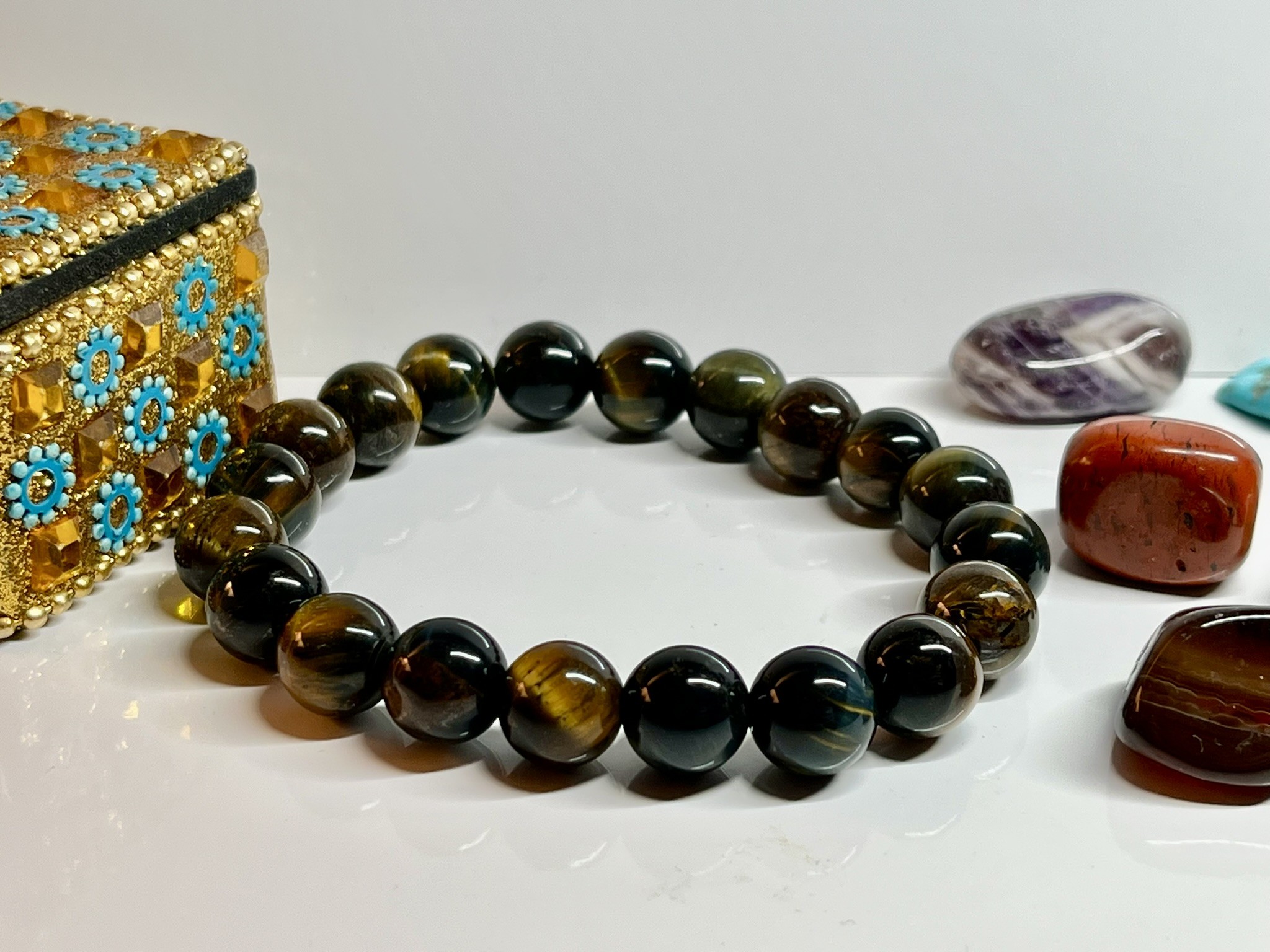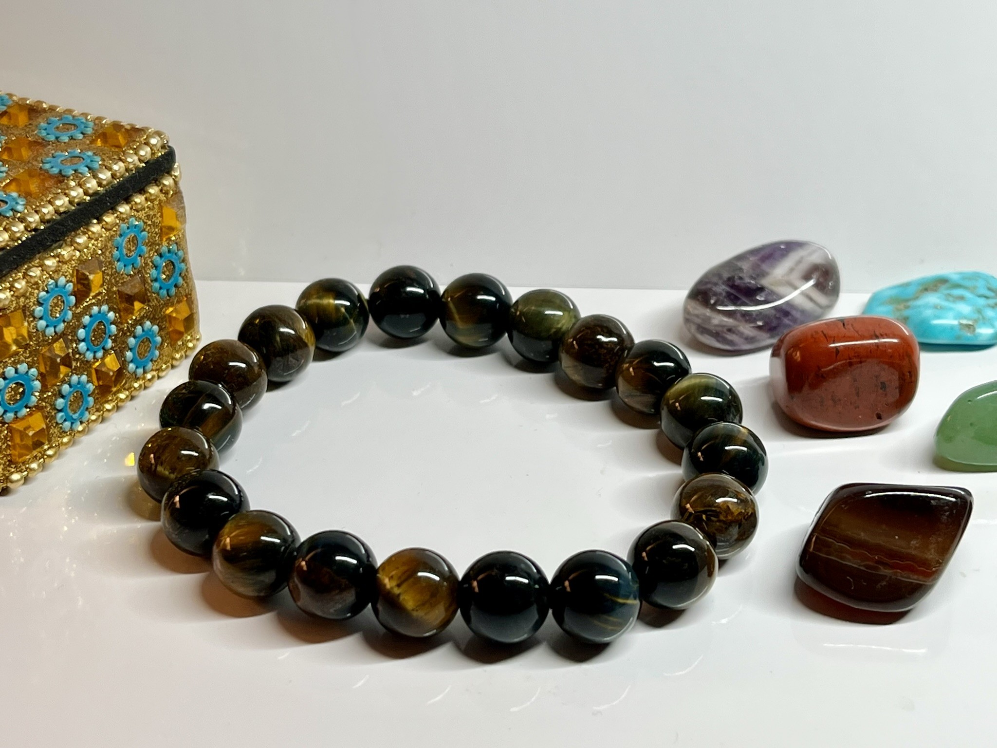L’"œil de tigre vert" est une variété de la pierre œil de tigre, connue pour ses reflets chatoyants et ses bandes de couleur. Alors que l’œil de tigre classique présente des tons dorés et bruns, la version verte affiche des nuances allant du vert olive au vert foncé, souvent mélangées à des teintes brunes ou dorées.