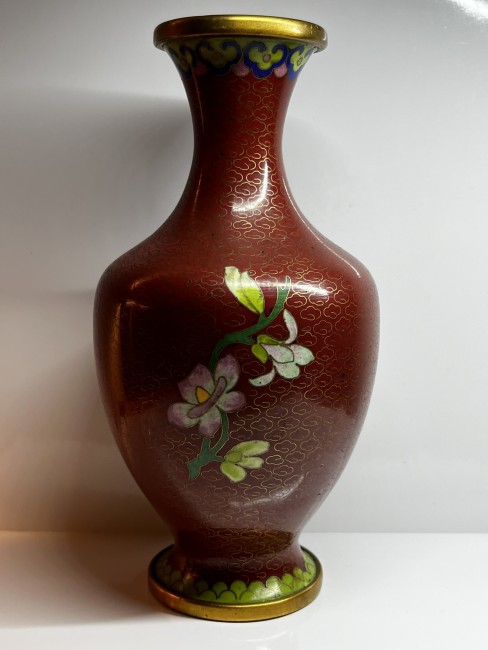 - Décor : fond rouge/bordeau orné de motifs floraux, avec des contours dorés typiques du cloisonné.