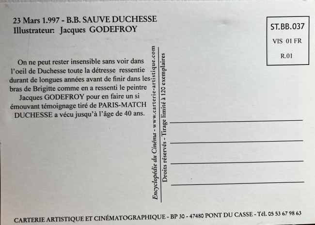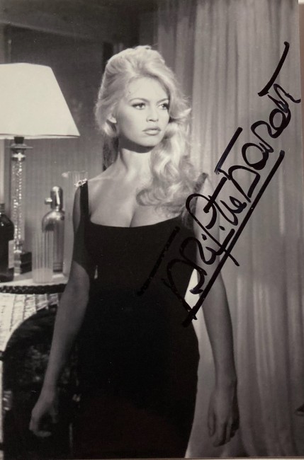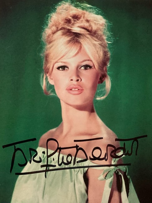Cet autographe m'a été offert par Mme Bardot en remplacement d'une photo qu'elle n'a pas voulu me signer car elle portait un pantalon en cuir sur cette photo ! Tout Brigitte . Un engagement total et une générosité extraordinaire