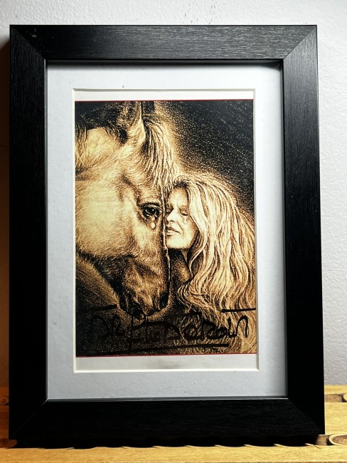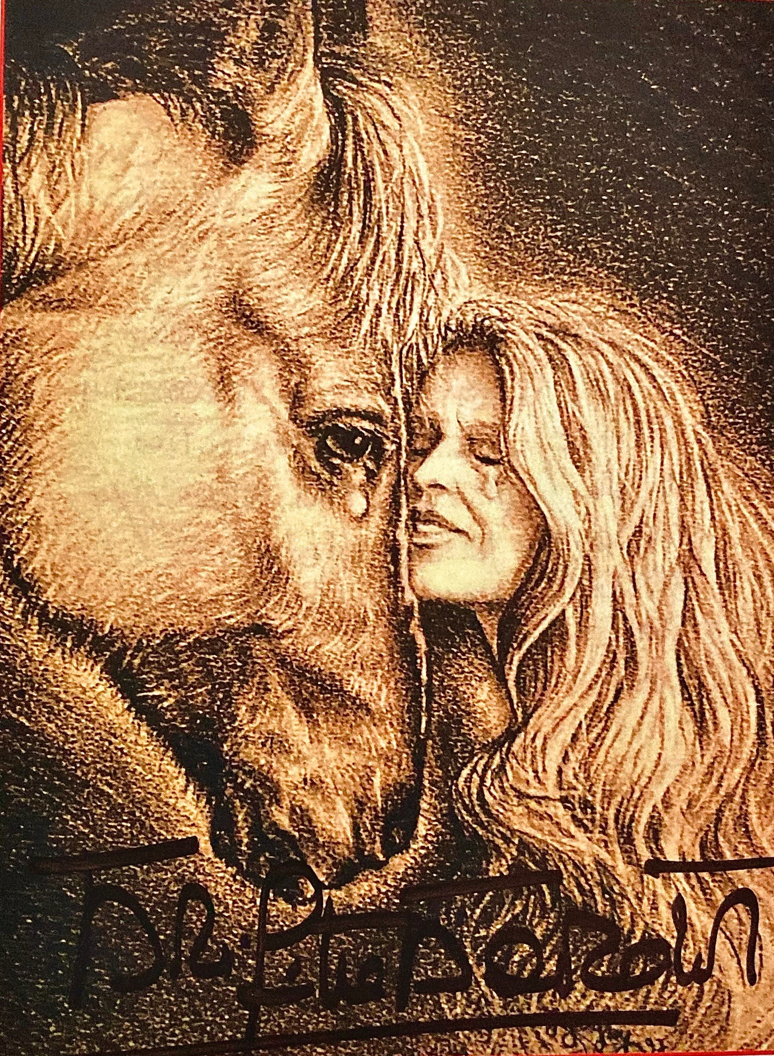 Signature au feutre noir sur une illustration de BB et du cheval Duchesse qu'elle a sauvée.