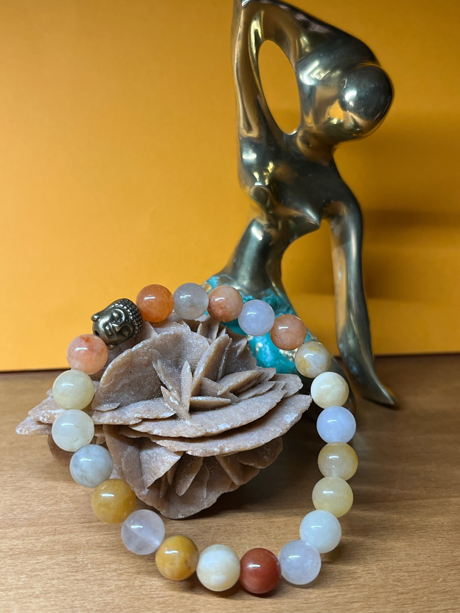 Un élément distinctif est la perle métallique en forme de tête de Bouddha, qui apporte une touche spirituelle et décorative à l’ensemble.- Cadeau symbolique :représente la paix, la sagesse et la sérénité.