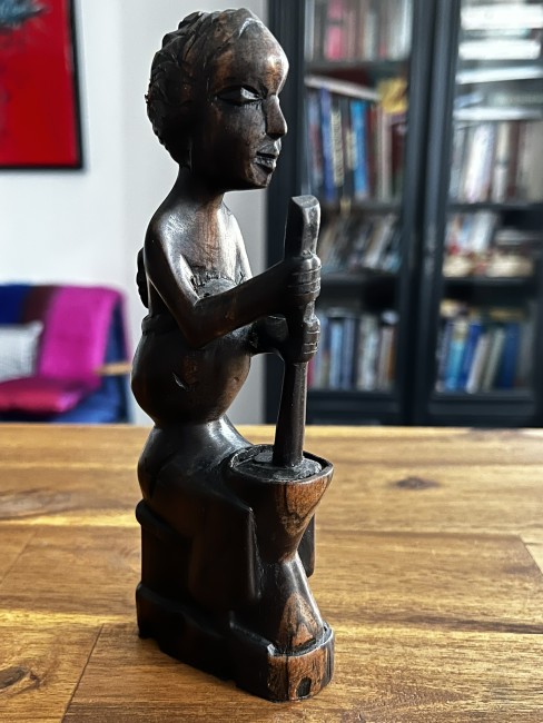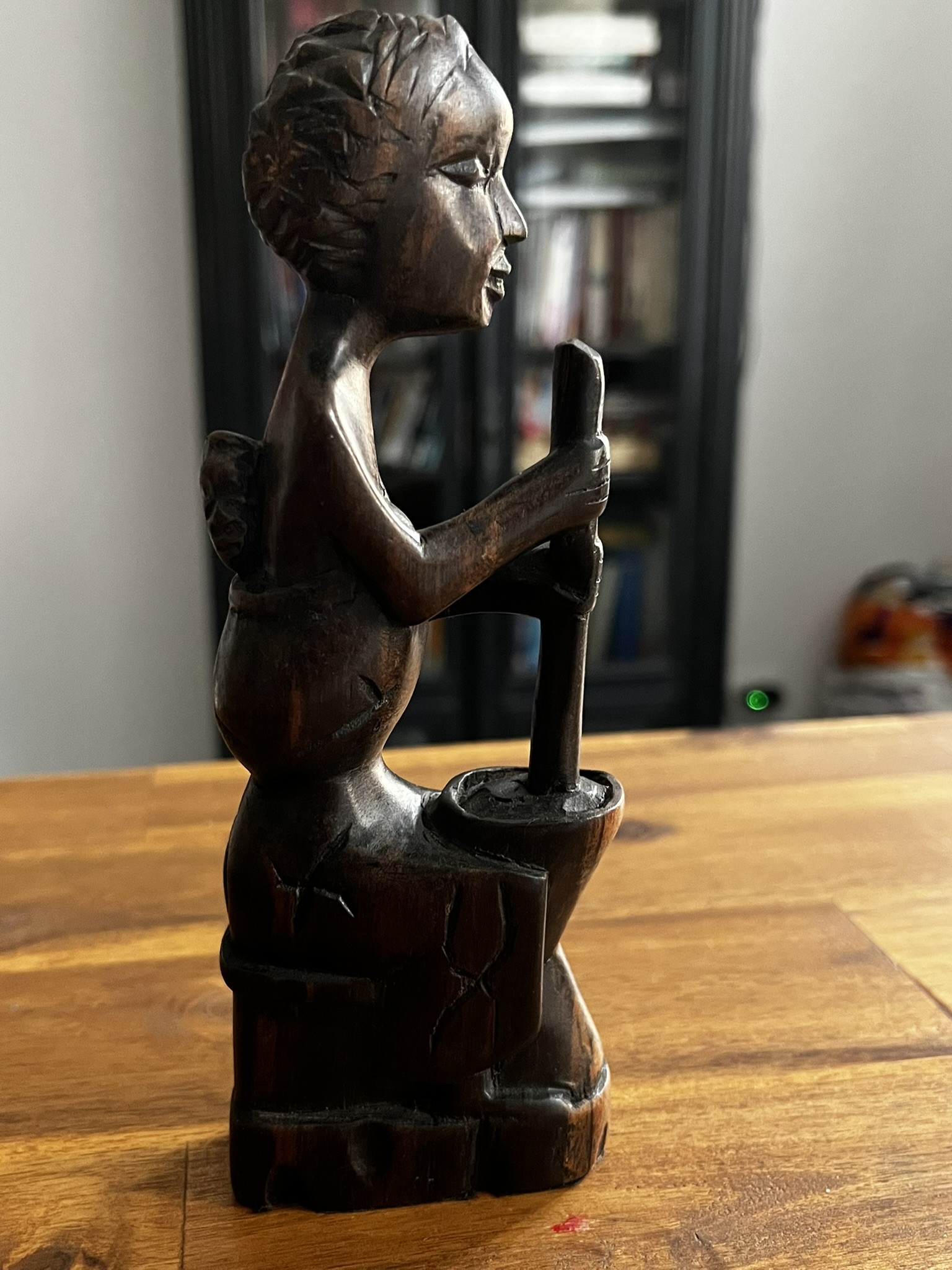 Figurine sculptée en bois dense représentant une femme et son enfant dans le dos en train de piler dans un mortier à l’aide d’un pilon.