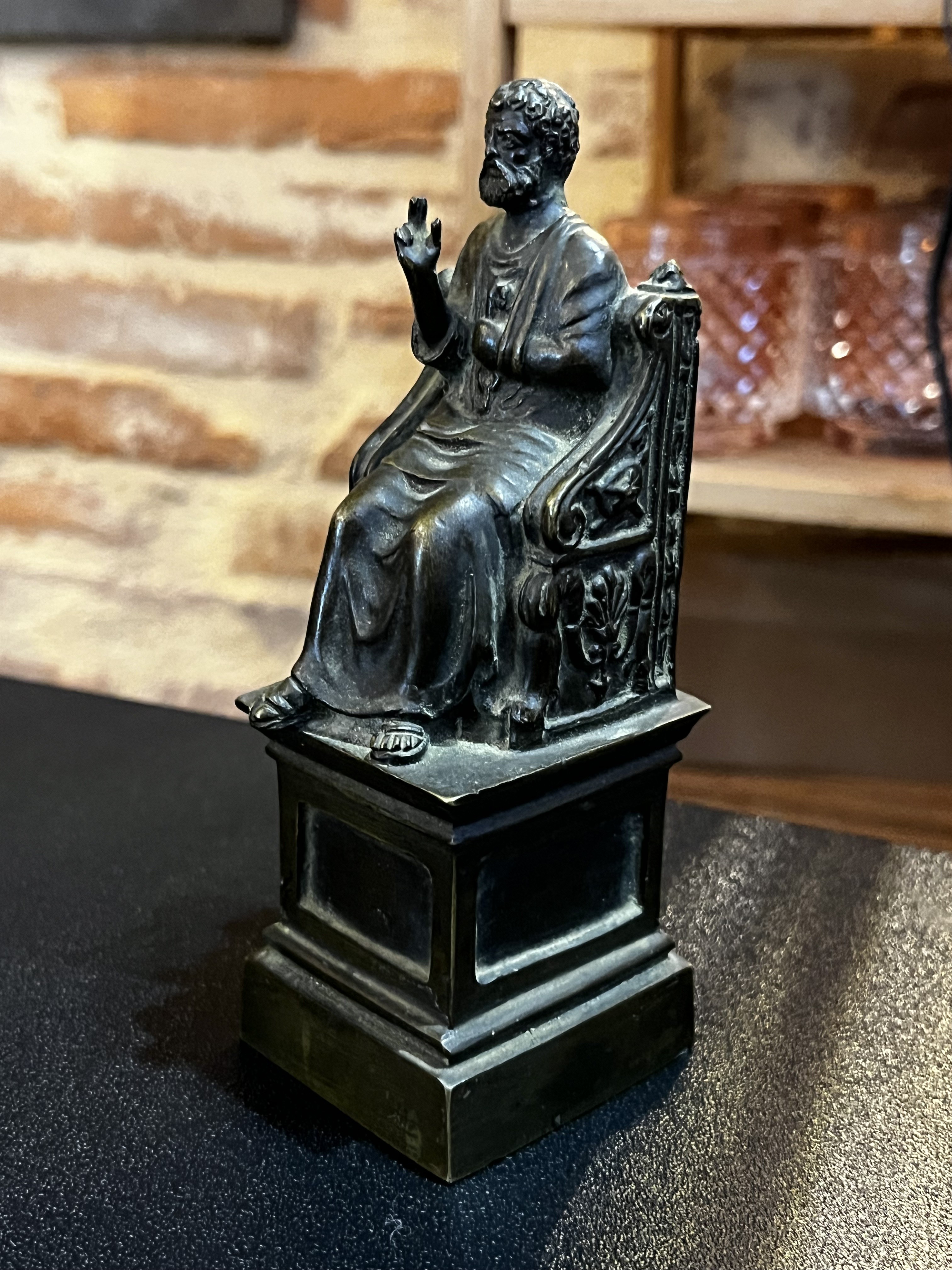 Statuette ancienne en bronze de Saint Pierre assis sur un trône richement décoré.