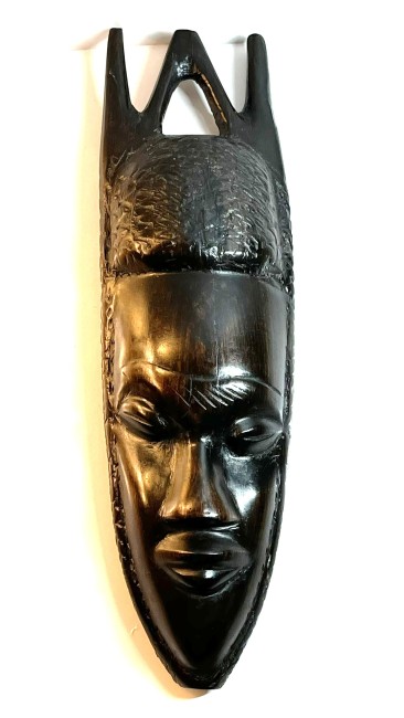 Le masque en bois sombre, en ébène, finement sculpté, avec un visage allongé, des traits stylisés et une coiffe élaborée.