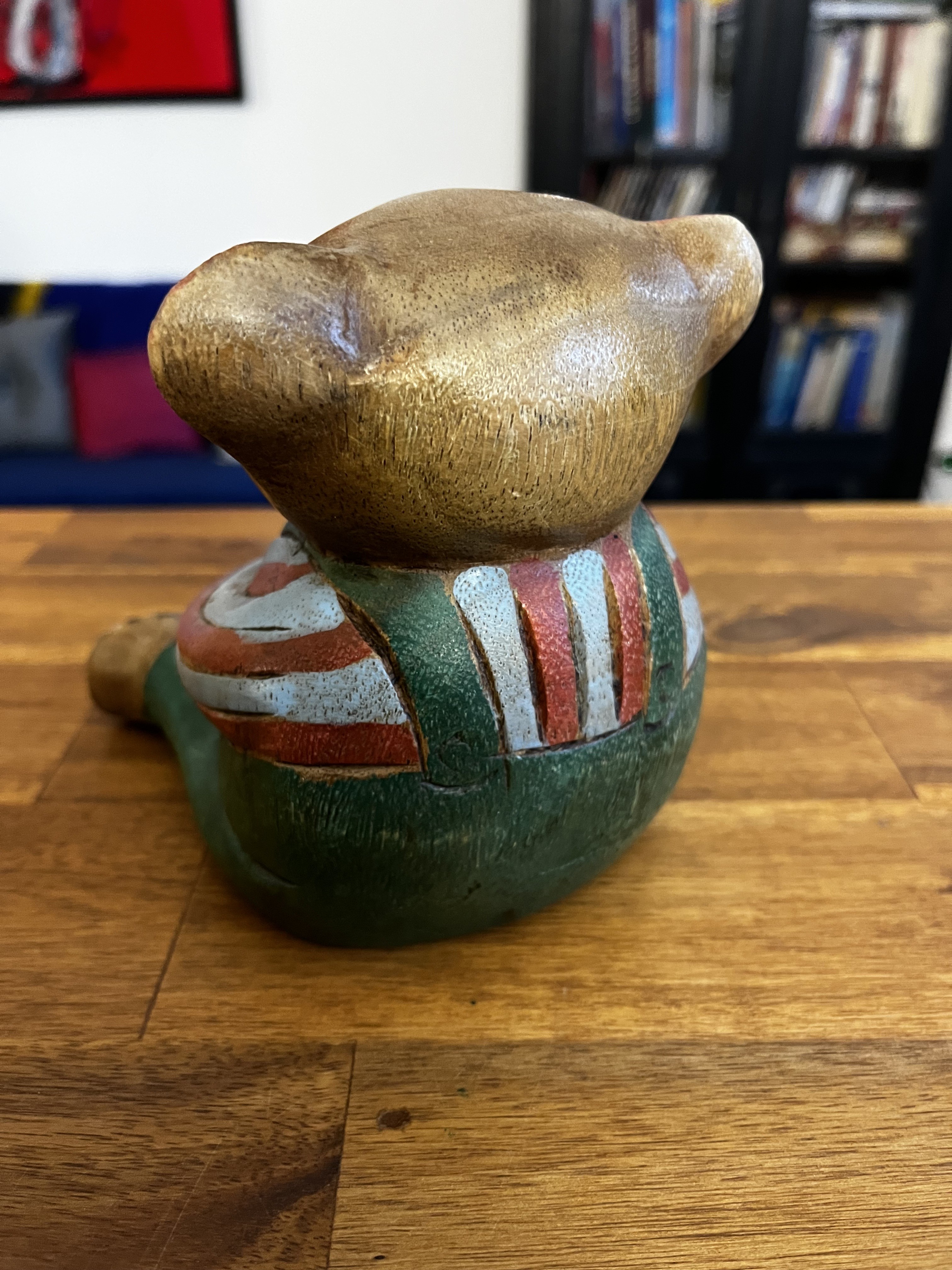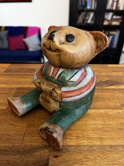 Superbe patine pour cet ourson en bois sculpté et peint à la main