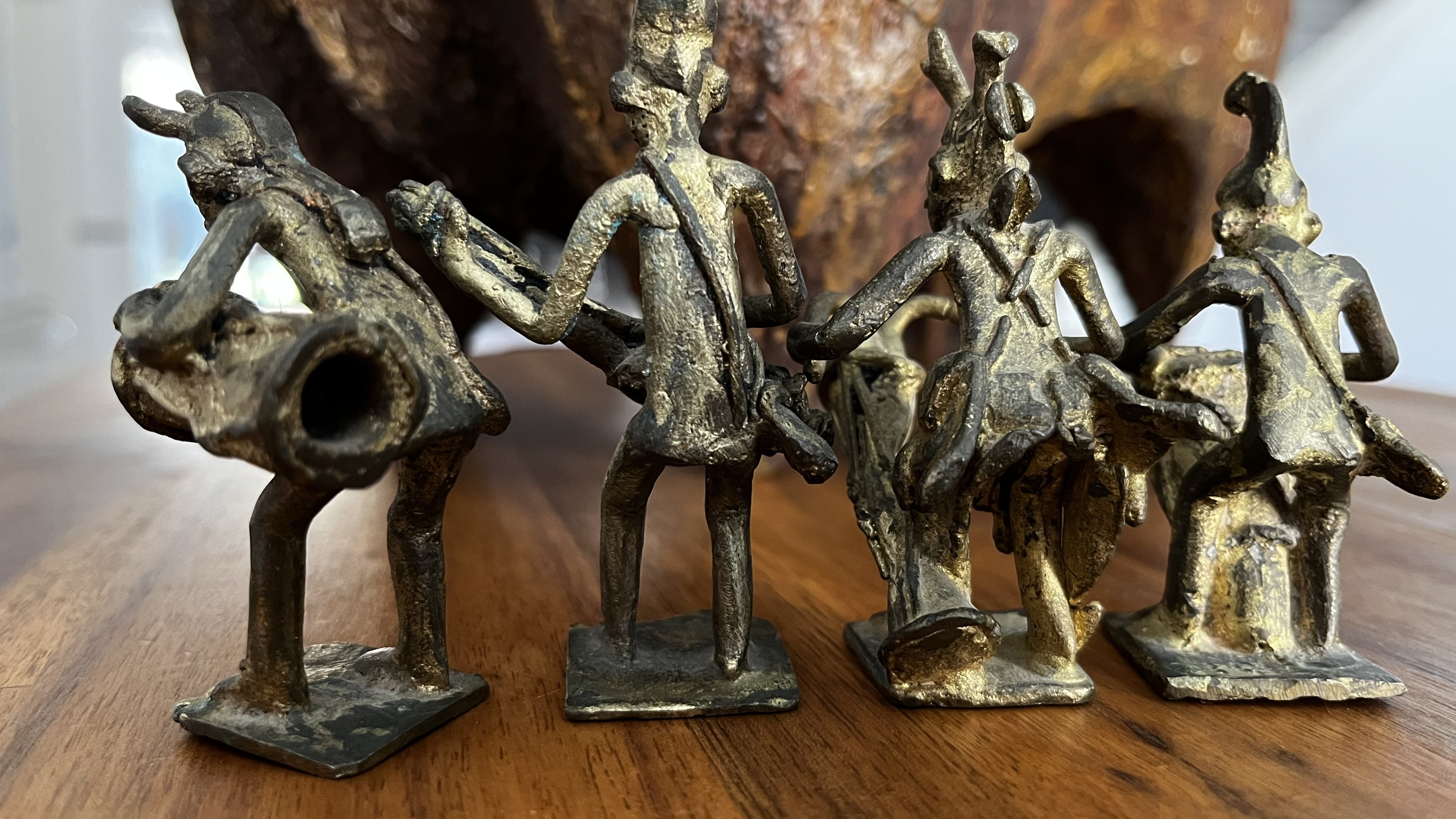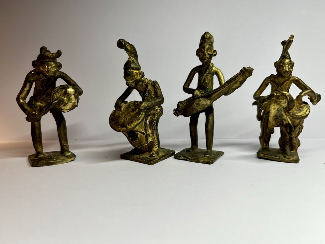 4 Figurines en bronze d'art tribal africain vintage, statuettes de musiciens de Côte d'Ivoire