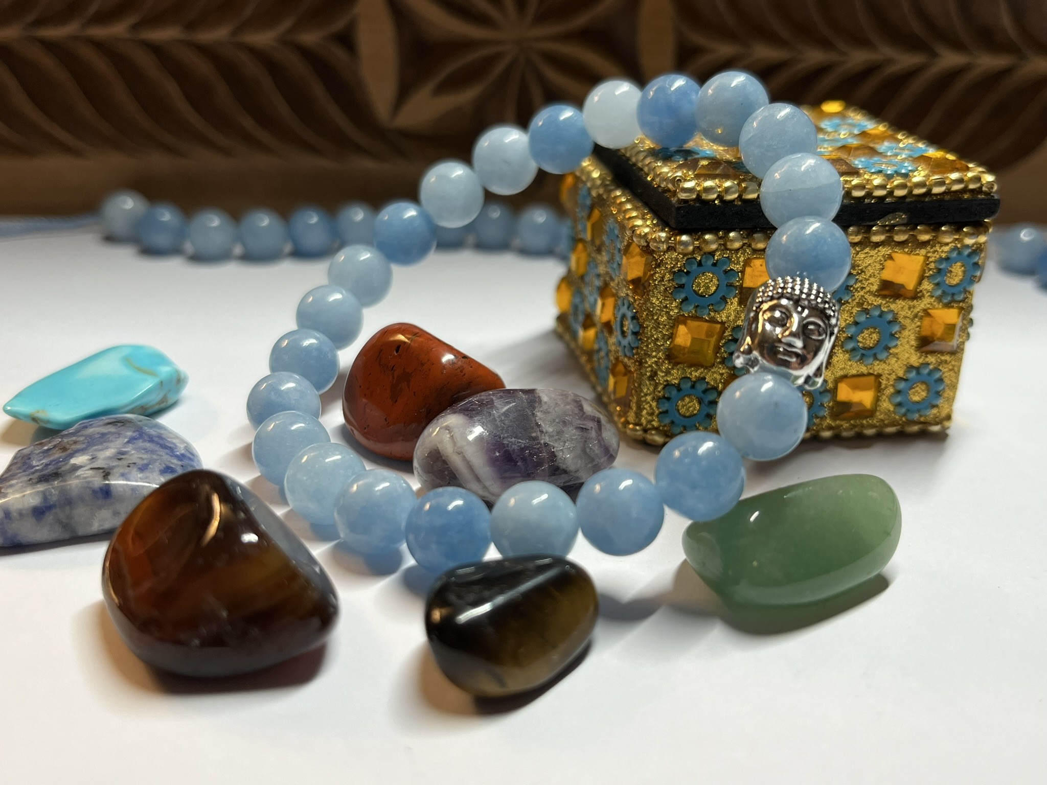 Les perles présentent des teintes variées allant du bleu ciel au bleu plus foncé