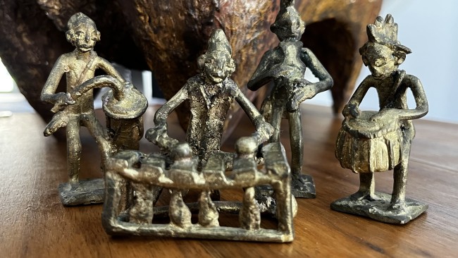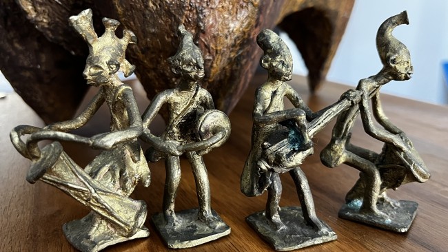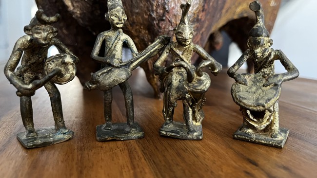 4 Figurines en bronze d'art tribal africain vintage, statuettes de musiciens de CĂ´te d'Ivoire